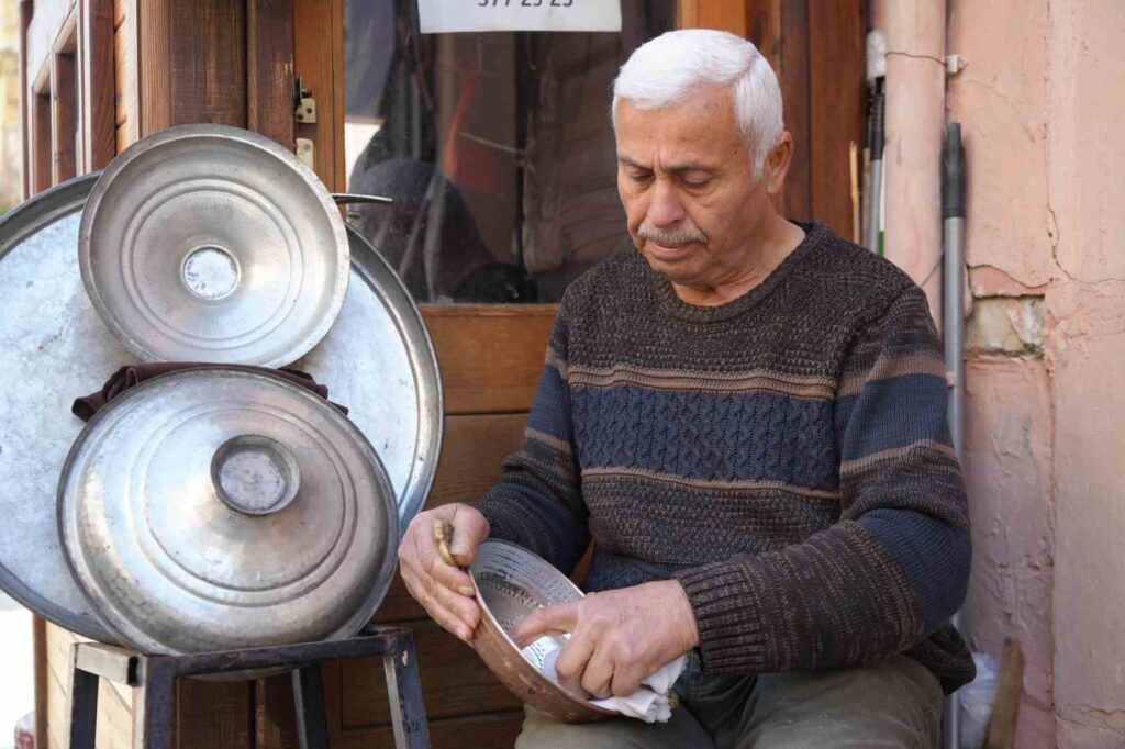 45 yıldır Sanat Sokağı’nda kalay yapan Öztürk, hala bakıra önem veren az sayıda vatandaştan gelecek kap kaçakları dükkânında bekliyor.