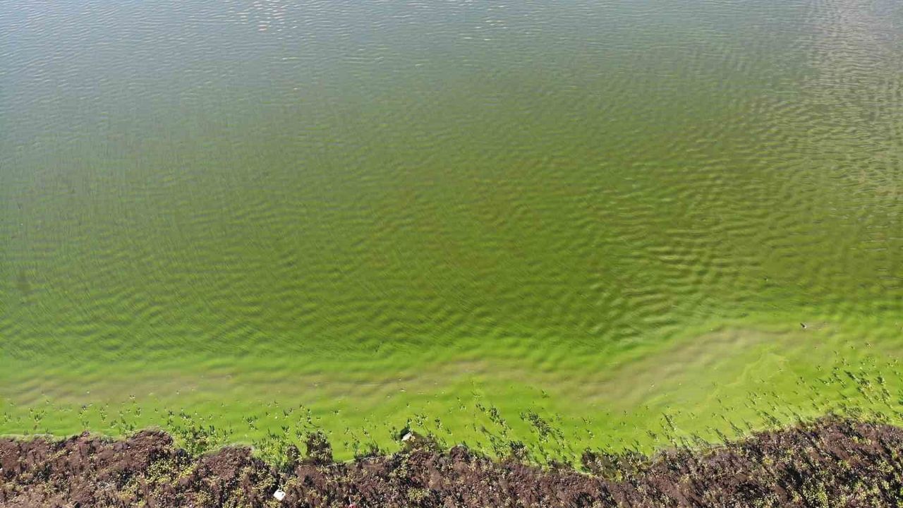 Öte yandan, yeşile bürünen baraj gölü havadan görüntülendi. Dron ile çekilen görüntülerde gölün kıyı şeridinin tamamen yeşile büründüğü görüldü.
