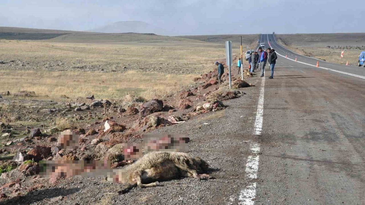 Kars’ta turistleri taşıyan tur midibüsü yolun karşısına geçirilen küçükbaş hayvan sürüsüne çarptı. Kazada 25 koyun telef olurken, jandarma ekipleri ve köylülerin çalışmasıyla hayvanlar yoldan kaldırıldı.
