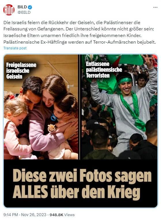 Bild Hamas tarafından serbest bırakılanlar için "İsrailli rehineler" ifadesini kullanırken, işgalci İsrail tarafından bırakılan ve yıllardır hücrelerde tutulan rehineler için "Serbest bırakılan Filistinli teröristler" ifadesini kullandı