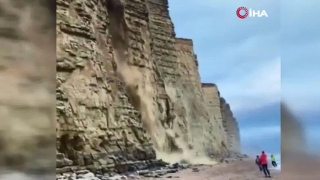 Deniz kıyısındaki tepelikten aniden kaya parçaları koparak sahile düştü. Bu sırada kumsalda yürüyen 3 kişi, ezilmekten saniyelerle kurtuldu.