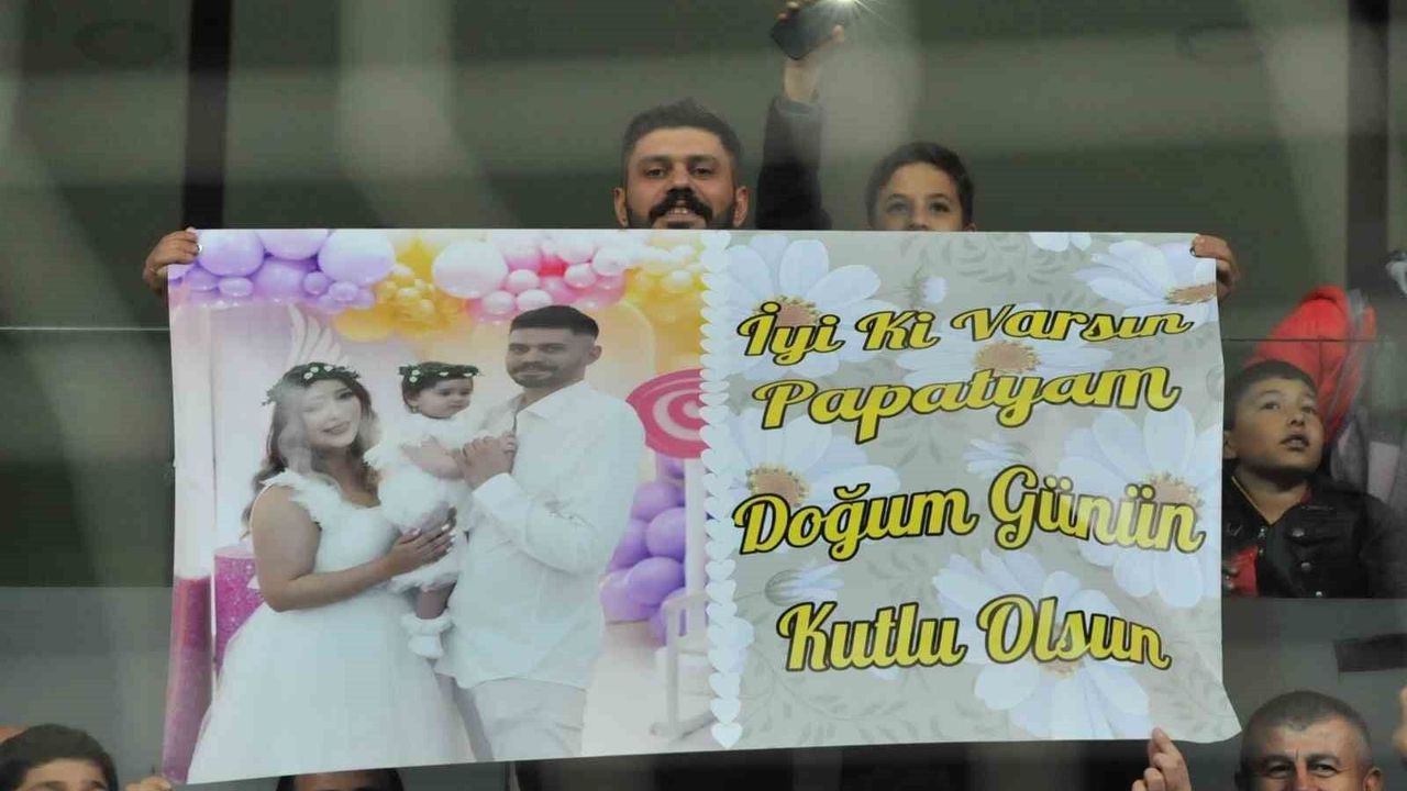 Süper Lig ekiplerinden Kayserispor taraftarları, tribünde renkli görüntüler oluşturuyor. Ligin 11. haftasında oynanan Kayserispor - Corendon Alanyaspor maçında Kayserispor taraftarı Anıl Aydın Katipoğlu, eşinin doğum gününü tribünde kutladı. Eşi Sevim ve kızları Tülay Ece’nin fotoğrafını pankarta bastıran Anıl Aydın Katipoğlu; ’İyi ki varsın papatyam, doğum günün kutlu olsun’ yazısıyla eşinin doğum gününü kutladı. Katipoğlu’nun pankartlı kutlaması, tribünden alkış aldı.