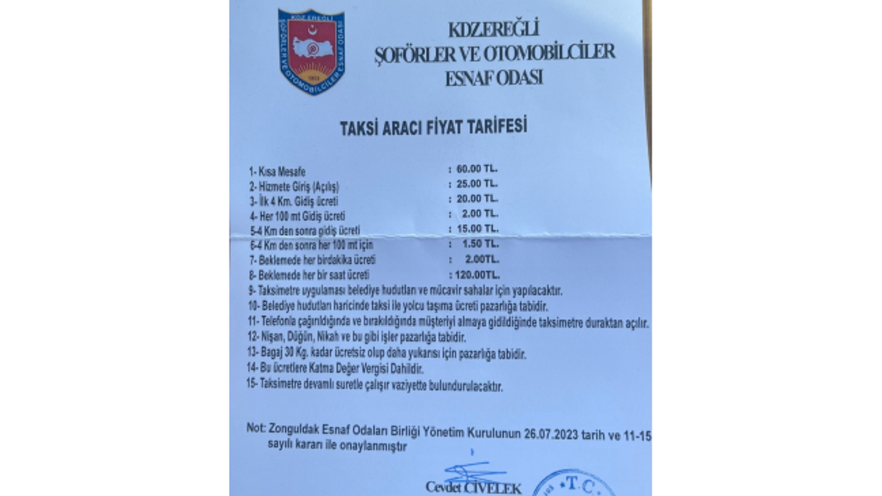 Zonguldak’ın Ereğli ilçesinde taksi ücretlerine zam yapıldı. Yapılan zamla kısa mesafe 60 TL oldu.