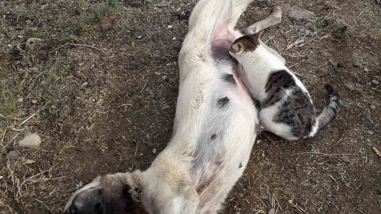 Tunceli’de, daha çok kavgaları ile bilinen kedi ile köpeğin görüntüsü izleyenleri şoke etti. Usulca köpeğin yanına sokulan kedi, patisiyle yerini yaptıktan sonra köpekten süt emdi.