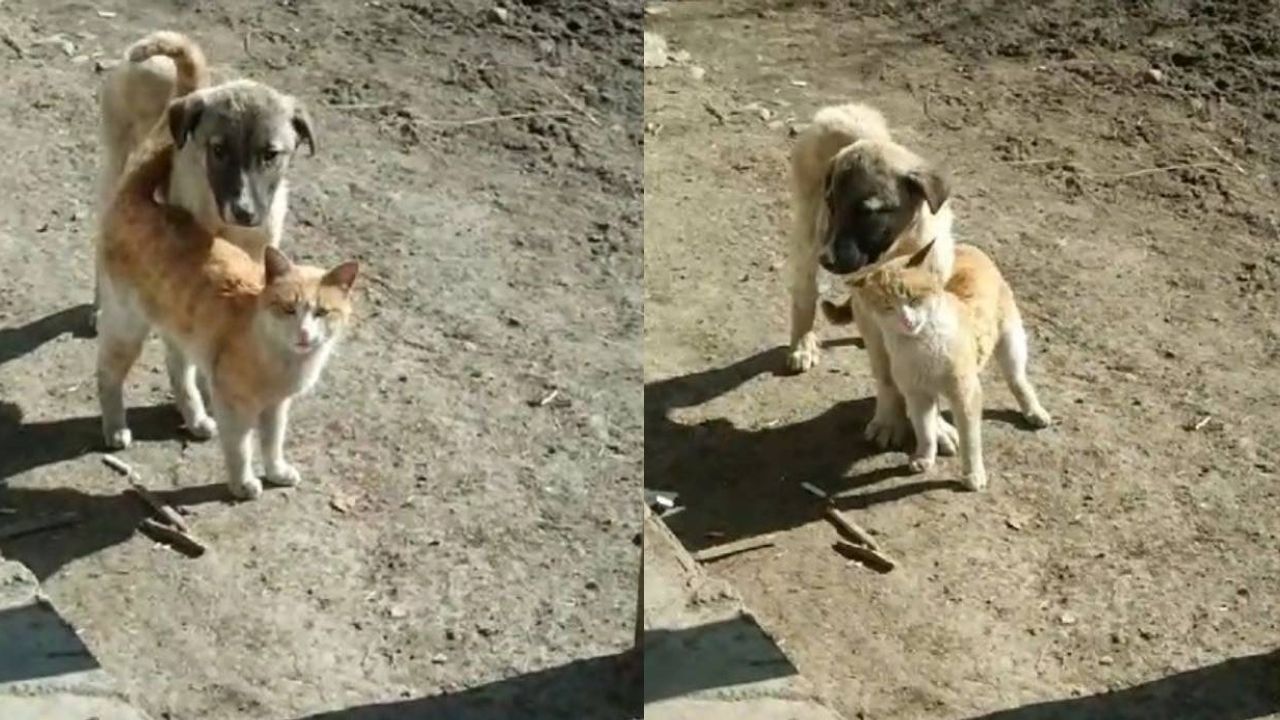 Kars’ın Akyaka ilçesine bağlı Şahnalar köyünde bir vatandaş tarafından kaydedilen görüntülerde, kedinin sevecen tavırlarla köpeğe sokularak ona güvenle yaslandığı ve oyun oynadığı anlar yer alıyor.