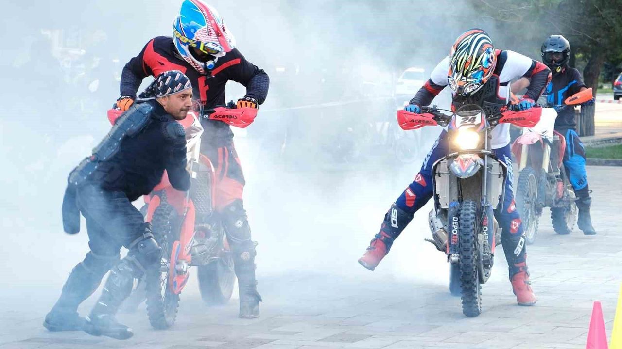 Erzincan Gençlik ve Spor İl Müdürlüğü, Avrupa Spor Haftası Etkinlikleri çerçevesinde belediye önünde düzenlenen gösteride motosiklet tutkunları yaptıkları adrenalin dolu hareketlerle izleyenleri keyifli anlar yaşattı. Motosikletli grup yaklaşık 200 metrelik enduro ve motocross parkurundaki engelleri aşarak heyecan yaşadı. Gerekli güvenlik önemlerin alındığı alanda yüzlerce vatandaş gösterileri keyifle izledi. Zaman zaman lastik yakma gösterileriyle de adeta duman bulutu oluşturan motosiklet tutkunları izleyenlerden tam not aldı.