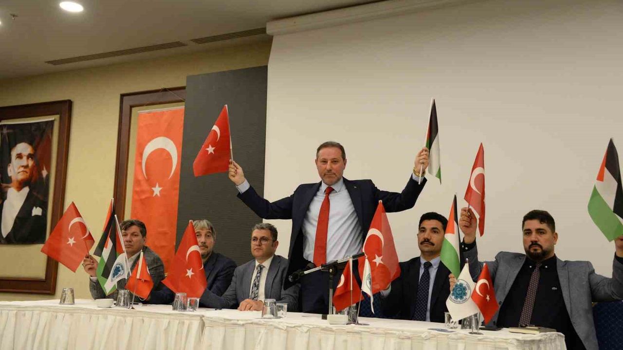 KONESOB Başkanı Muharrem Karabacak’ın okuduğu bildiride, “Bir aydır, Gazze’de acı var, Gazze’de vahşet var, Gazze’de Katliam var, Gazze’de zulüm var, Gazze’de soykırım var, Gazze’de açlık ve susuzluk var, Gazze’de gözü yaşlı anneler ve babalar var Çünkü Gazze’de savunmasız bebek ve çocuk ölümleri var İsrail açıkça bir savaş suçu işlemektedir. İsrail vahşetinde hayatını kaybeden tüm Filistinli kardeşlerimize Yüce Allah’tan rahmet, yaralılara acil şifalar diliyoruz. Bugün burada Gazze’de kardeşlerimizin acılarını paylaşıyoruz. İsrail’in, Filistin topraklarında, özellikle Gazze’de sivil ve savunmasız halka yönelik uyguladığı terör, şiddet ve özellikle hastaneleri hedef alarak en temel insan hakkı olan yaşam hakkını ihlale yönelik girişimleri gün geçtikçe vahim bir boyuta ulaşmıştır. İşgalci İsrail’in bu saldırıları, artık sabrımızı taşırmaktadır. Bu saldırılar biran evvel durdurulmalıdır. Filistin topraklarında işlenen katliam ve savaş suçundan dolayı İsrail, dünya kamuoyuna hesap vermek zorundadır. İsrail’in saldırganlığının ve Filistin halkına yaptığı zulmün karşısında durmaya, Filistinli kardeşlerimizin özgürlük ve hukuk mücadelesini de sonuna kadar savunacağız. Bu alçak işgal girişimin bir an önce sona ermesini ve bölgede kalıcı ateşkesin biran evvel tesis edilmesini temenni ediyoruz. Başkenti Doğu Kudüs olan 1967 sınırları içerisinde bağımsız Filistin devletini artık tüm dünya tanımalıdır. 84 Odamız ve 61 bin Esnaf ve Sanatkarlarımız adına hükümetimizin bu yönde alacağı her türlü karar tam destek vereceğimizi ilan ediyoruz. İsrail’i şiddetle kınıyor ve lanetliyoruz. Gazze’de yaşanan ve tarihte benzeri olmayan bu vahşet derhal son bulmalıdır. Dualarımız Filistinli kardeşlerimizle beraberdir. Yüce Mevla yar ve yardımcıları olsun” dedi.