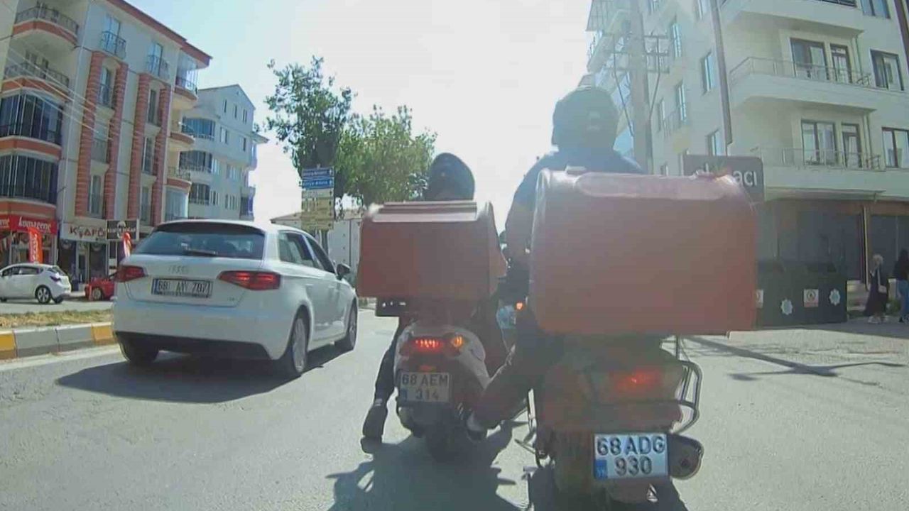 Aksaray’da motosikleti arızalanan kurye, bir başka kurye arkadaşı tarafından motosikleti ayağıyla itmek sureti ile trafikte seyretti. İki motosikletli kuryenin tehlikeli yolculuğu kameraya yansırken, yolculuk kilometrelerce sürdü.