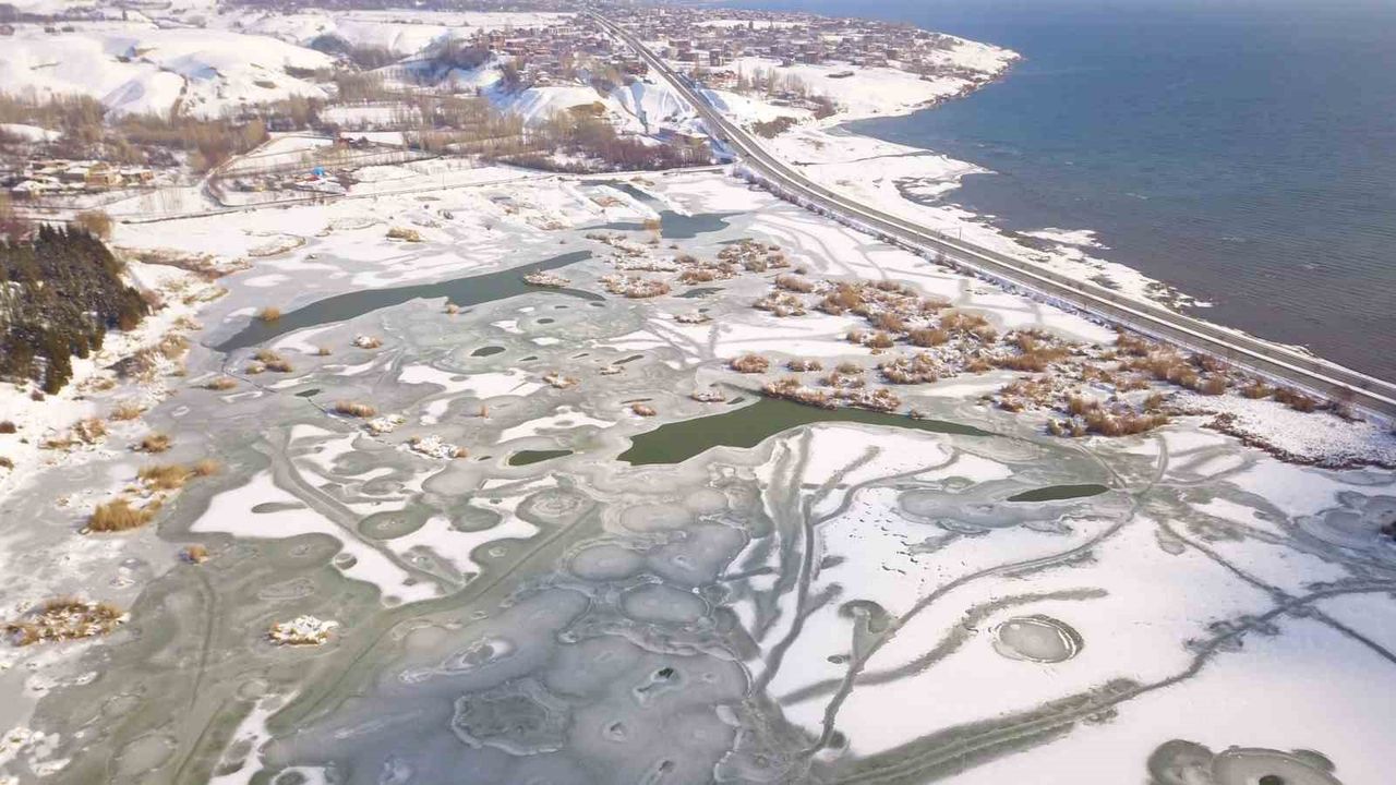 Kar yağışı sonrası dondurucu soğukların etkisini gösterdiği Ahlat’taki gölet ve bazı küçük şelaleler dondu. Ahlat’ı etkisi altına alan soğuk havalar nedeniyle ilçenin Yamlar mevkiinde bulunan ve onlarca kuş türüne ev sahipliği yapan Vali Uğur Boran Kuş Cenneti’nin yüzeyi de buzla kaplandı. Yüzeyi buz tutan kuş cennetinin doğal güzelliği ise havadan drone ile görüntülendi. Kuş cennetinin donması, çok sayıda kuşun sıcak bölgelere göç etmesine sebep olurken gölün donmayan akarsu yatağında bulunan bazı kısımlarında ise az sayıda kuş türü yaşamını sürdürüyor.