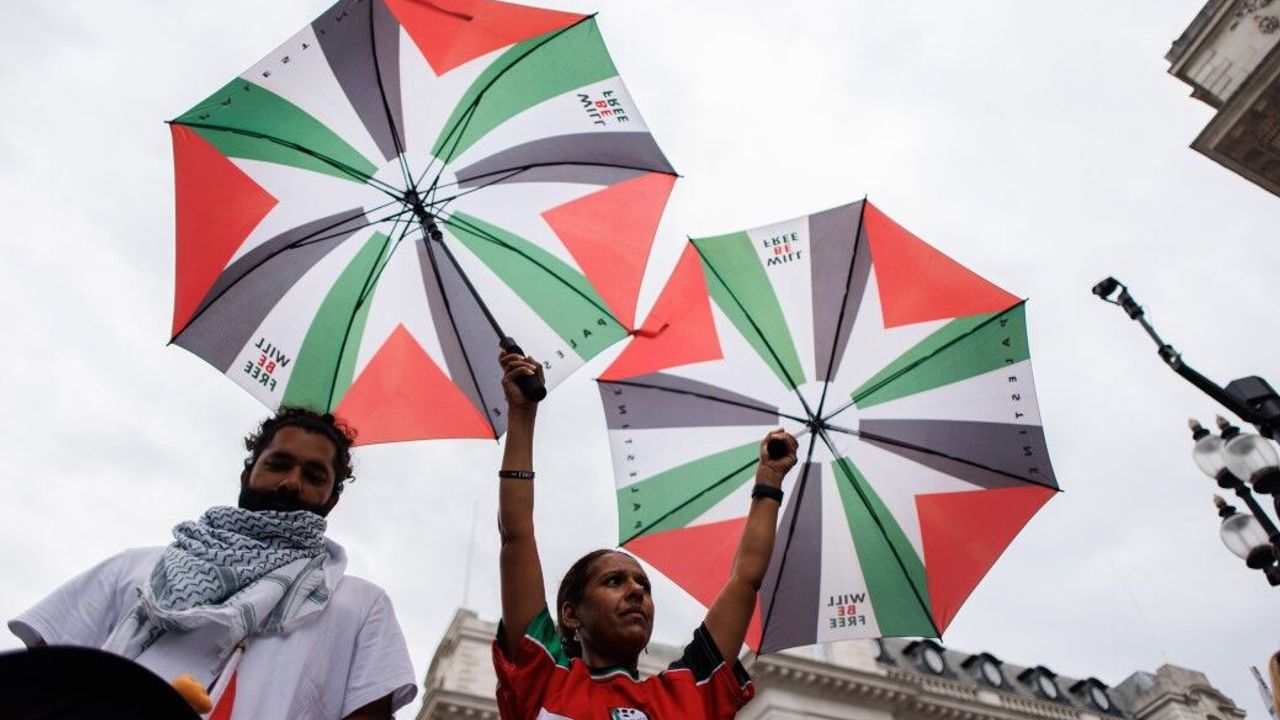“Özgür Filistin”, “Nehirden denize Filistin özgür olacak” sloganları atan göstericiler, “Derhal Ateşkes”, “Filistin’e Özgürlük” İngiltere’nin İsrail’e silah ihracatını derhal durdurması çağrısı yaptı.