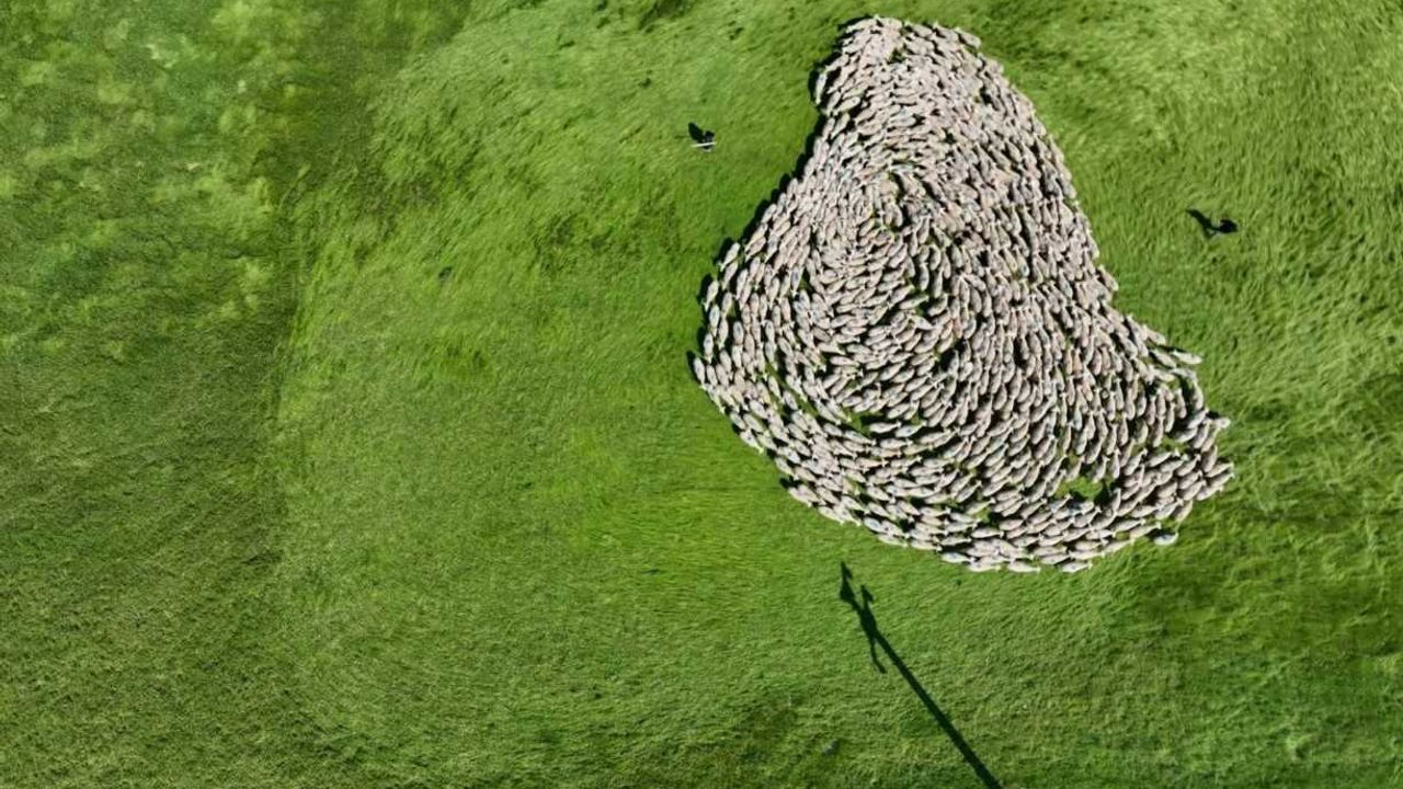 Gökyüzünden çekilen bu eşsiz görüntüler, doğayla iç içe hayvancılığın sanatsal bir anlatıma dönüştüğünü gözler önüne serdi. 20 bin küçükbaş hayvanın meralarda otlatıldığı işletmede, çobanlar tarafından yönlendirilen sürünün senkronize hareketi, izleyenleri adeta mest etti. Çobanların yönlendirmesiyle oluşan bu dairesel hareketin gökyüzünden görüntüsü, adeta bir dans gösterisini andırdı.
