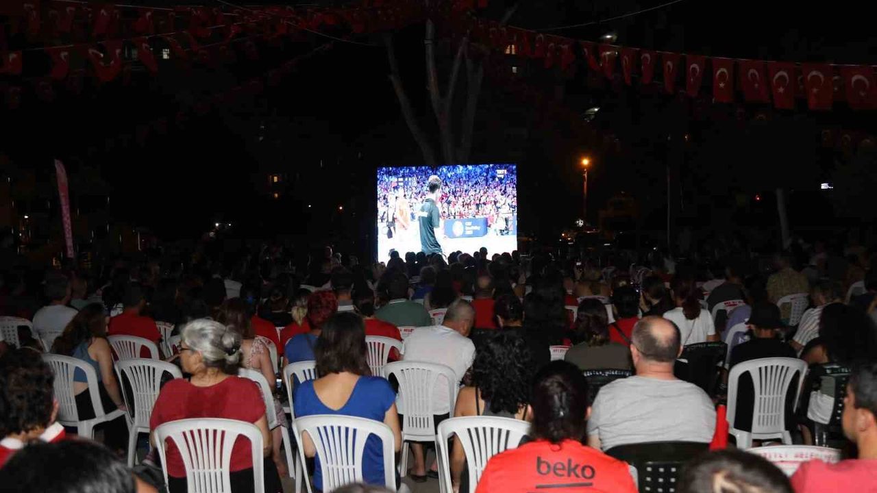 Mezitlililer, karşılaşmayı Menderes Mahallesi’ndeki Demokrasi Meydanında belediye tarafından kurulan dev ekranda izledi. Bazı vatandaşlar, Türkiye formasıyla katıldığı alanda ‘Filenin Sultanları’nın aldığı her sayı için alkış ve tezahüratlar eşliğinde destek verdi. Millilerin şampiyonluğunu büyük bir sevinçle kutlayan Mezitlililer, hep bir ağızdan ‘İzmir Marşı’nı okudu.