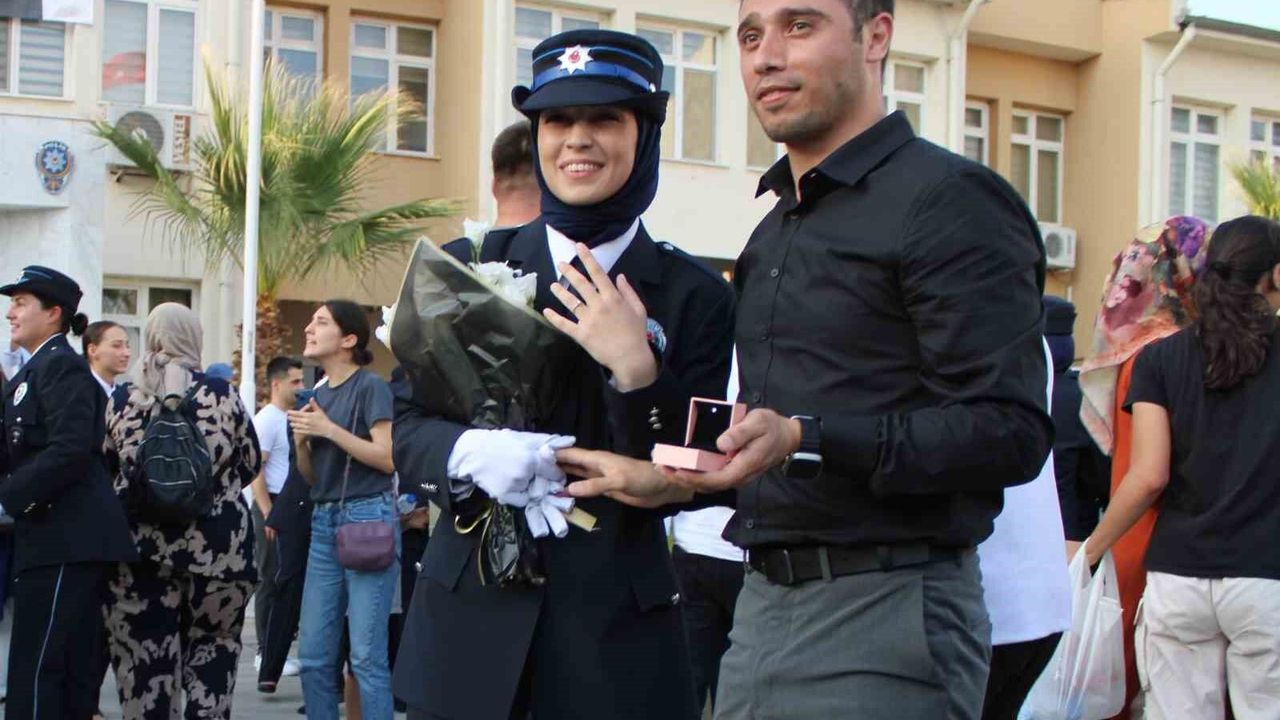 Aydın Polis Meslek Eğitim Merkezi (POMEM) 30. dönem mezunlarını düzenlenen törenle verdi. POMEM bahçesinde gerçekleştirilen yemin töreninin ardından polis adayı Şerife Kırbaç, kep atarak mezun oldu. Törene katılan polis memuru Önder Dursun ise mezuniyetin ardından kep atan kız arkadaşı Şerife Kırbaç’a sarılarak önce mezuniyet sevincine ortak oldu. Ardından dizlerinin üzerine çöken Dursun, cebindeki yüzüğü çıkararak sürpriz evlilik teklifi yaptı. Teklif karşısında şaşkınlığını gizleyemeyen Kırbaç’ın mutluluğu gözlerinden okundu. Evlilik teklifine, çocuklarının mezuniyet törenini izlemek için gelen aileler ve genç çiftin arkadaşları da alkış ve ıslıklarla destek verdi.