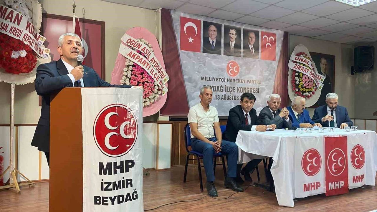 Kongrede partililere seslenen MHP İzmir İl Başkanı Veysel Şahin, “14 ve 28 Mayıs seçim süreçlerinde gördük ki karşımızda sadece yarıştığımız siyasi partiler yok. Türkiye’nin ilerlemesini durdurmak, gelişmesini yavaşlatmak ve gücünü kırmak isteyen küresel organizasyonlar var. O günleri hep birlikte yaşadık. Sizler de ilçelerinizde büyük zorluklar ve engellemeler gördünüz. Ama hepsini aştınız. Hep birlikte omuz omuza vererek, milli mücadelemize bir yeni sayfa daha eklediniz, Milletimizin lider ülke Türkiye hayalini gerçeğe dönüştürmek için büyük çaba gösterdiniz ve partimizin onurunu çiğnetmediniz. Şimdi o günlere bakarak kendimde ve sizlerde daha güçlü bir mücadele azmi görüyorum. Yerel seçimleri kazanma gayreti görüyorum. İnanıyoruz ki bu birlik yerel seçimlerde MHP’nin en büyük zafer kaynağı olacaktır” dedi.