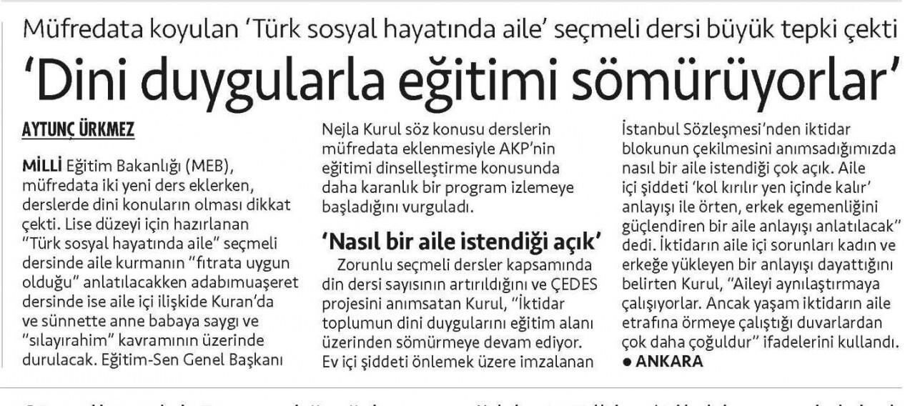 Ortaöğretim Genel Müdürlüğünce hazırlanan "adabımuaşeret" dersinin, MEB Temel Eğitim Genel Müdürlüğünce hazırlanan "görgü kuralları ve nezaket" dersinin müfredatı, Talim ve Terbiye Kurulu Başkanlığının onayından, geçtiğimiz günlerde geçmişti. Ortaokullarda tüm kademelerde seçmeli olarak okutulacak "görgü kuralları ve nezaket" dersi ile öğrencilerin iletişimde görgü kurallarının ve nezaketin önemini fark etmeleri, aile içinde, okulda, toplum içerisinde ve kişiler arası ilişkilerde görgü kurallarına ve nezakete uygun davranış sergilemeleri amaçlanıyor. Derslerde, öğrencilerin farklı kültürlerde görgü kuralları ve nezaketin önemini kavramaları, çevreye karşı duyarlı olmaları ve dijital ortamlarda görgü kuralları ve nezaketin önemini fark etmeleri hedefleniyor. Ancak hükümet karşıtı Cumhuriyet gazetesi alınan yeni karar hakkında, halk tarafından beğenilmediğini ileri sürerek ‘Türk sosyal hayatında aile’ dersinin ‘büyük tepki çektiğini’ gazetelerine taşıdı. Cumhuriyet gazetesi, Milli Eğitim Bakanlığının almış olduğu karardan dolayı hükümeti eleştirirken röportaj yaptıkları Eğitim-Sen Genel Başkanı Nejla Kurul şunları ifade etti: “Söz konusu derslerin müfredata eklenmesiyle, AKP’nin eğitimi dinselleştirme konusunda daha karanlık bir program izlemeye başlamıştır.”