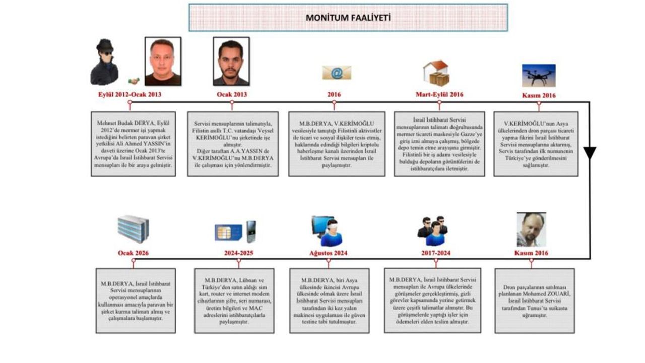 İsrail İstihbarat Servisi mensuplarından aldığı talimat doğrultusunda Veysel Kerimoğlu’nu işe alan ve maaşını bile istihbaratçılardan temin eden Mehmet Budak Derya, arkadaşlık ilişkisi de geliştirdi. M.B. Derya, V. Kerimoğlu ile attıkları her adımı İsrail servisi ile paylaştı. Mehmet Budak Derya, Veysel Kerimoğlu vesilesiyle Orta Doğu ülkelerine yönelik ticari faaliyetlerini arttırdı. Yine V. Kerimoğlu sayesinde tanıştığı, İsrail’in Orta Doğu ülkelerine yönelik politikalarına muhalif Filistinliler ile sosyal ve ticari ilişkilerini geliştirdi. Bu şahıslar hakkında topladığı bilgileri İsrail servisine aktardı. İsrail’in Gazze’yi işgal politikası çerçevesinde tesis ettiği ticari ilişkileri de kullanarak Gazze’ye giriş izni almaya çalıştı. Gazze’de aradığı depoların fotoğraflarını İsrail istihbaratına iletti.
