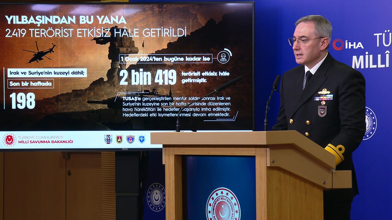 Milli Savunma Bakanlığı tarafından haftalık bilgilendirme toplantısı gerçekleştirildi. Bakanlıkta gerçekleştirilen basın toplantısında konuşan Milli Savunma Bakanlığı Basın Halkla İlişkiler Müşaviri Tuğamiral Zeki Aktürk, gündeme dair son gelişmeleri aktardı. Türk Silahlı Kuvvetleri’nin terörü kaynağında yok etme anlayışıyla kesintisiz bir şekilde ve kararlılıkla sürdürdüğü operasyonlara dikkati çeken Tuğamiral Aktürk, “Irak ve Suriye’nin kuzeyi dâhil son bir haftada 198, 1 Ocak’tan bugüne kadar ise 2 bin 419 (Irak bin 256 / Suriye: bin 163) teröristi etkisiz hâle getirmiştir” ifadelerini kullandı.