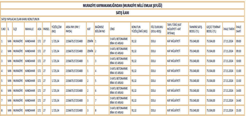 | 1-Yukarıdaki tabloda nitelikleri belirtilen Kamu Konutlarının 2886 sayılı Kanununun 45. Maddesine göre satış ihaleleri Van Çevre ve Şehircilik İl Müdürlüğü Milli Emlak Müdürü odasında (Yenişehir mahallesi Muradiye Hükümet Konağı 2. Kat Milli Emlak Şefliği Muradiye/ VAN) toplanacak komisyon huzurunda belirtilen gün ve saatte yapılacaktır. | |||||||||||||||||