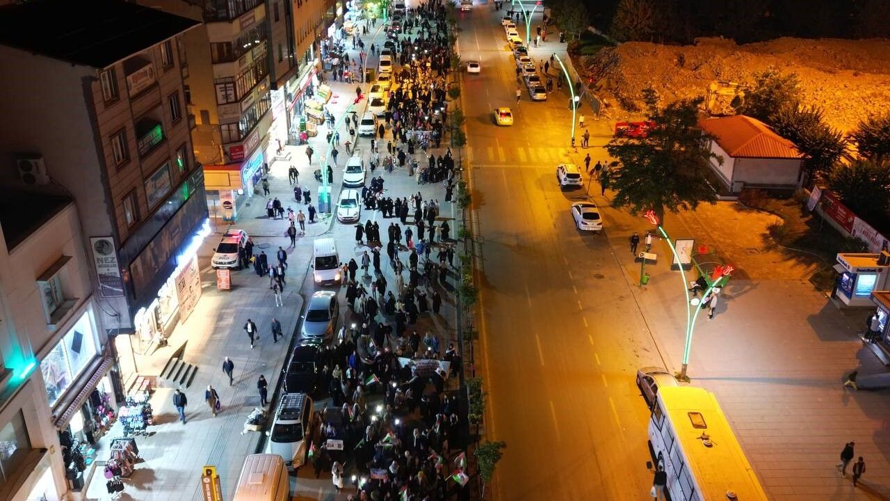 Konuşmanın ardından vatandaşlar. ellerinde Filistin ve Türk bayraklarıyla sloganlar atarak Kent Meydanı’ndan İmamı Şafi Camii’ne kadar yürüdü. Burada dua edilmesinin ardından kalabalık sessizce dağıldı.