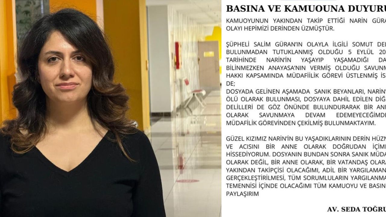 “Kamuoyunun yakından takip ettiği Narin Güran olayı hepimizi derinden üzmüştür. Şüpheli Salim Güran'ın olayla ilgili somut delil bulunmadan tutuklanmış olduğu 5 Eylül 2024 tarihinde Narin'in yaşayıp yaşamadığı dahi bilinmezken anayasanın vermiş olduğu savunma hakkı kapsamında müdafilik görevi üstlenmiş isek de; dosyada gelinen aşamada sanık beyanları, Narin'in ölü olarak bulunması, dosyaya dahil edilen diğer delileri de göz önünde bulundurarak bir anne olarak savunmaya devam edemeyeceğimden müdafilik görevinden çekilmiş bulunmaktayım. Güzel kızımız Narin'in bu yaşadıklarının derin hüznü ve acısını bir anne olarak doğrudan içimde hissediyorum. Dosyanın bundaki sonraki müdafi olarak değil, bir anne olarak, bir vatandaş olarak yakından takipçisi olacağım. Adil bir yargılamanın gerçekleştirilmesi, tüm sorumluların yargılanması temennisi içinde olacağım.”