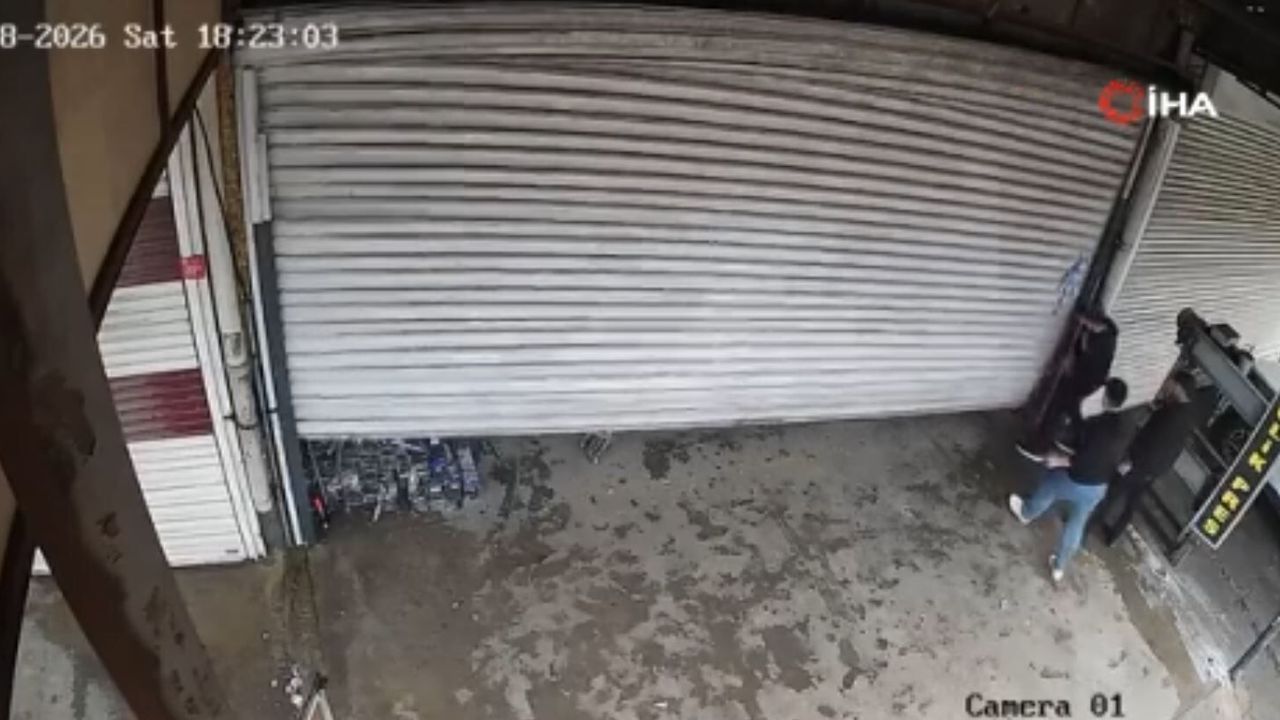 Edinilen bilgilere göre, kentte bulunan sanayi sitesindeki bir oto tamir dükkanında otomatik kepenk kapatılmaya çalışıldı. Kepenk, kapı önünde bulunanlardan birinin tekme vurmasıyla düşerek yerle bir oldu. O anlar iş yerinin güvenlik kamerasına yansıdı.