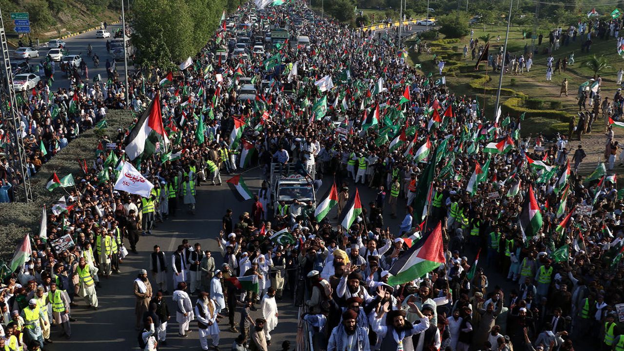 Filistin bayraklarıyla yürüyüşe katılan göstericiler, İsrail’in masum sivilleri hedef aldığını belirterek, İsrail karşıtı sloganlar attı. Göstericiler başkent İslamabad'daki parlamento ve bakanlıkların bulunduğu kırmızı bölge girişine kadar yürürken, polis bölgeyi tamamen kapattı.