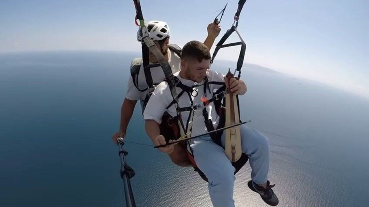 Arkadaşlarıyla birlikte Tekirdağ’ın popüler yamaç paraşütü merkezlerinden biri olan Uçmakdere Mahallesi’ne gezmeye gelen Gökdeniz, Ganos Dağı’nın eteklerinde yamaç paraşütü yapanları görünce bu maceraya katılma kararı aldı. Ancak bu sıradan bir uçuş değildi. Gökdeniz’in aklında başka bir fikir vardı, gökyüzünde kemençe çalmak.