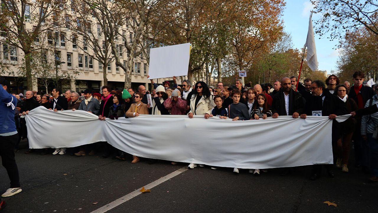 İsrail’in 7 Ekim’den bu yana Gazze Şeridi’ne yönelik saldırıları devam ederken, dünyanın dört bir yanından Gazze Şeridi’nde ateşkes için eylemler sürüyor. Fransa’nın başkenti Paris’te sanatçıların ve entelektüellerin girişimiyle ateşkes için sessiz yürüyüş düzenlendi. Dünya Arap Enstitüsü önünde başlayan yürüyüş, Yahudi Sanat Müzesi’nin önünden geçilmesinin ardından Arts et Métiers Meydanı’nda son buldu.