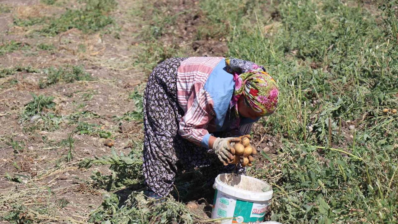 Sıcak havada patates toplayan işçilerden Emine Saltan, “Sıcak havada patates toplaması zor olmaz mı? Kırmızı şapkayla yüzümün rengi aynı oldu, zor” şeklinde konuştu.
