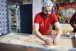 Yüksek dereceli sıcaklık önünde çalışmanın kendisini zorlamadığını anlatan pide ustası Ferat Karataş, "Biz günlük aşağı yukarı 7 saat 450 derecelik fırın ateşi önündeyiz. Tahinli pide, yumurtalı susamlı pideye başlıyoruz ve zamanımız da kalmıyor, daha sonra ise iftar için etliekmek işi başlıyor. Günümüzün 6-7 saatlik bölümünü ateş önünde bu şekilde devam ediyoruz. Kolay desek yalan olur ama biz gerçekten alıştık. Gerçekten bu mübarek ayda Allah sabrını veriyor. Herkes bu mübarek ayda özellikle serine kaçarken biz tam tersi sıcağa kaçıyoruz. Vücut alıştı. Zor oluyor gerçekten bakıldığı zaman ama bizim için artık kolay oluyor. Herkes ‘Nasıl dayanıyorsun' diyor ama bizim için de alışık durum olunca böyle oluyor" dedi.