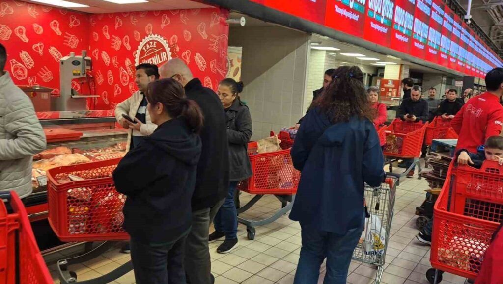Ramazan ayının gelmesiyle birlikte bazı marketler et ürünlerinde fiyat sabitlemesine gitme kararı aldı. Alınan bu kararın ardından fiyatları güncelleyen bir zincir markette ucuz fiyata et almak isteyen vatandaşlar uzun kuyruklar oluşturdu. Kasaplarda kilogram fiyatının ortalama 500 ile 600 TL arasında değişen kıymanın fiyatı 379 TL’den satışa sunuldu. Haramidere’deki marketten ucuz et alabilmek için çevre ilçelerden vatandaşlar akın etti. Dakikalarca kuyrukta bekleyen vatandaşlar fiyatların beklemeye değer olduğunu dile getirdi.