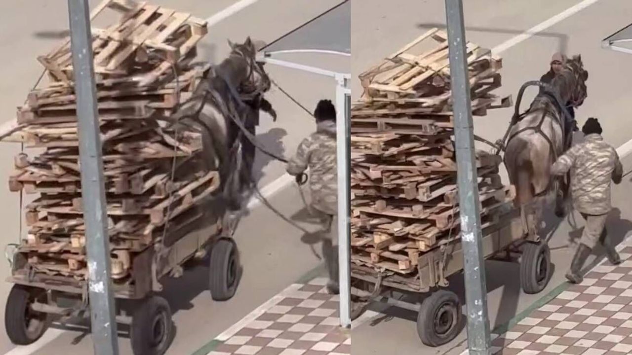 Aşırı yük nedeniyle yükün ağırlığı altında güçlükle ilerleyen atın dengesini sağlamakta zorlandığı anlar, çevrede bulunan bir vatandaş tarafından cep telefonu kamerasıyla kaydedildi.