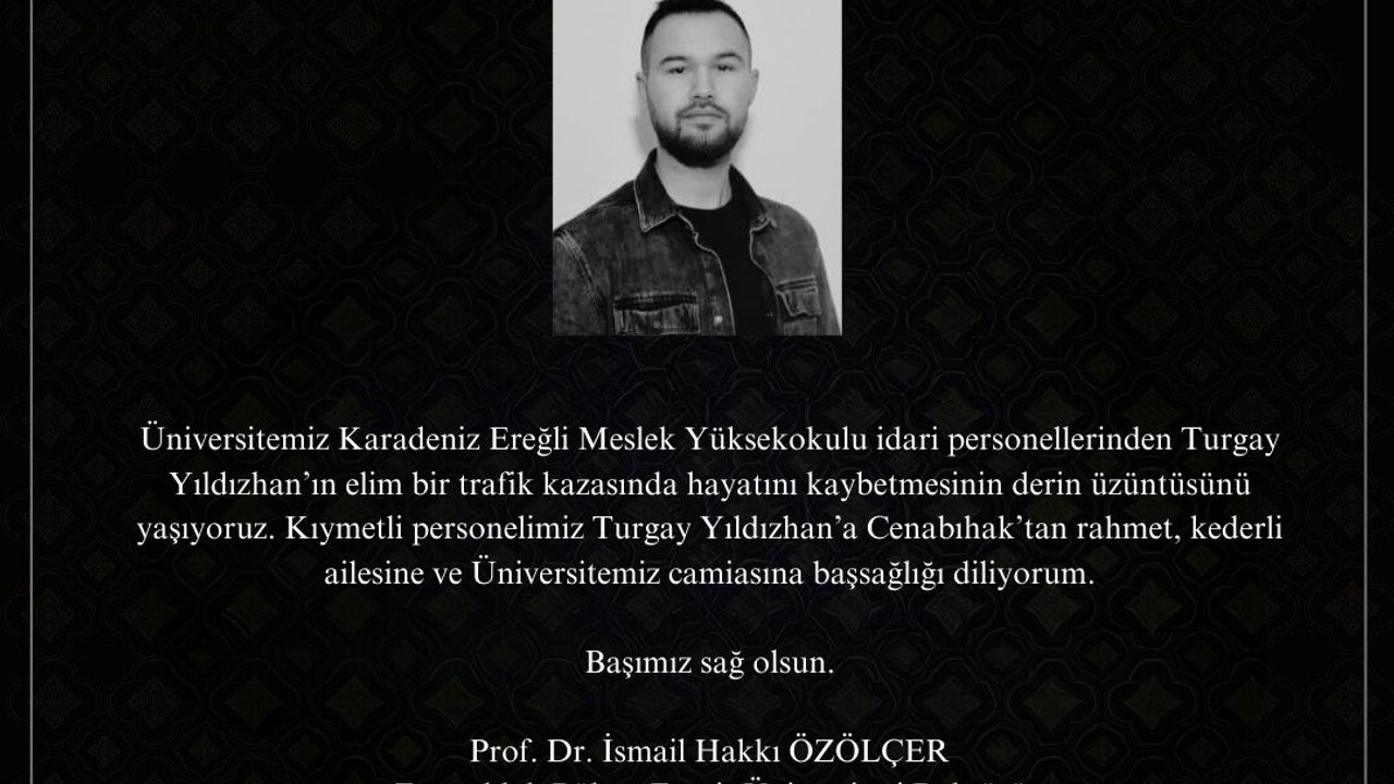 "Üniversitemiz Kdz. Ereğli Meslek Yüksekokulu idari personellerinden Turgay Yıldızhan’ın elim bir trafik kazasında hayatını kaybetmesinin derin üzüntüsünü yaşıyoruz. Kıymetli personelimiz Turgay Yıldızhan’a Cenabıhak’tan rahmet, kederli ailesi ve üniversitemiz camiasına baş sağlığı diliyorum."