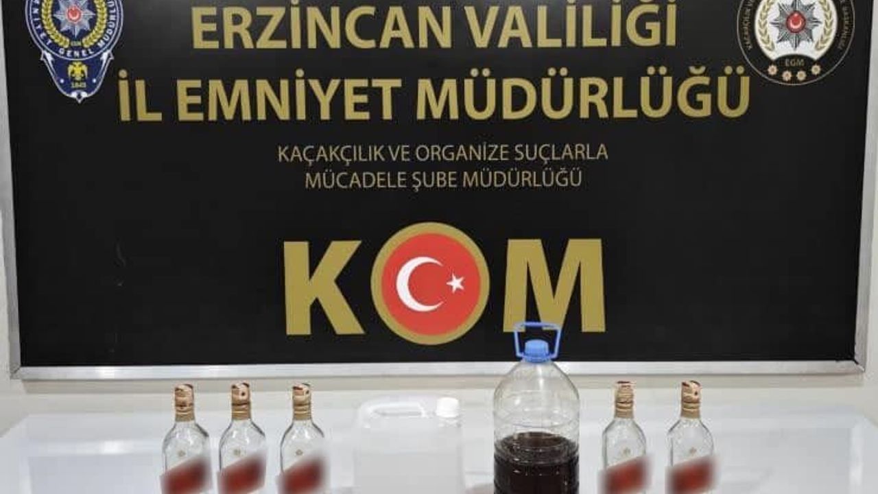Erzincan İl Emniyet Müdürlüğü Kaçakçılık ve Organize Suçlarla Mücadele Şube Müdürlüğü ekiplerince il genelinde 5607 SKM suçunun önlenmesi, kaçak/sahte alkollü içki ve yasadışı içki imalatında kullanılan başta etil alkol olmak üzere ürünlerin ticaretinin engellenmesi ve söz konusu ürünlerin toplum nezdinde ulaşılabilirliğinin azaltılması faillerin tespiti, şüphelilerin yakalanması ve suç unsurlarının ele geçirilmesi amacı ile yapılan çalışmalar neticesinde Ş.A. isimli şahsa ait ikamette yapılan aramada; 3,5 litre satışa hazır el yapımı viski, 5 litre etil alkol, içki satışında kullanılan 5 adet boş viski şişesi ele geçirildi.