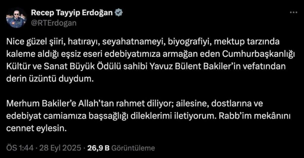 “Nice güzel şiiri, hatırayı, seyahatnameyi, biyografiyi ve mektup tarzında kaleme aldığı eşsiz eseri edebiyatımıza kazandıran Cumhurbaşkanlığı Kültür ve Sanat Büyük Ödülü sahibi Yavuz Bülent Bakiler’in vefatından derin üzüntü duydum. Merhuma Allah’tan rahmet, ailesine, dostlarına ve edebiyat camiamıza başsağlığı diliyorum. Rabb’im mekânını cennet eylesin.”