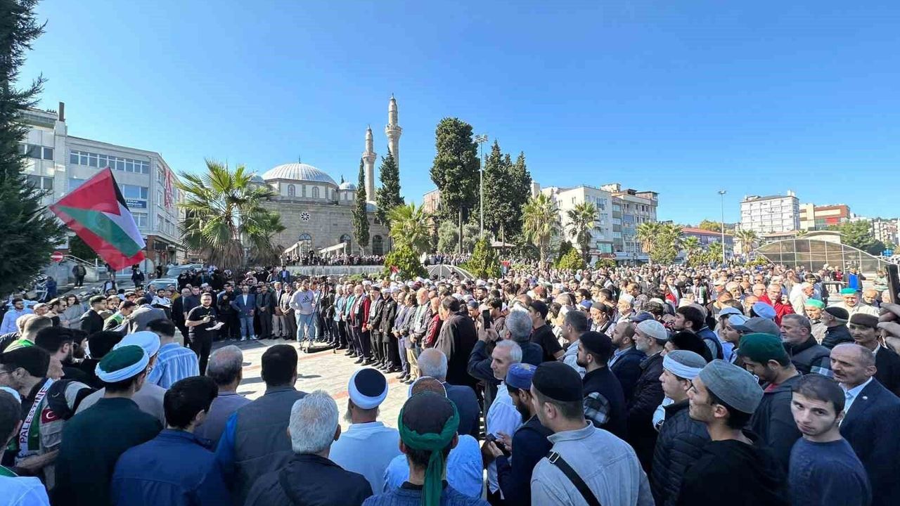 İlkadım ilçesinde bulunan Büyük Camii’nde cuma namazı çıkışı toplanan sivil toplum kuruluşları, kamu kurum ve kuruluşlarının temsilcileri ile vatandaşlar Filistin’de hayatını kaybeden insanlar için gıyabı cenaze namazı kıldı.