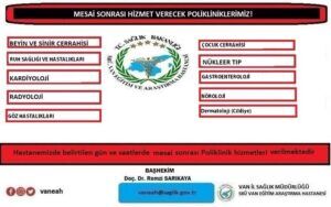 SBÜ Van Eğitim ve Araştırma Hastanesi hastaların mağdur olmaması adına mesai sonrası bazı polikliniklerinde hizmet veriyor. Hastane yönetimi tarafından bugün mesai sonrası hizmet verecek poliklinikler paylaşıldı. Bugün mesai sonrası hizmet verecek olan poliklinikler sırasıyla şöyle, “Beyin ve Sinir Cerrahisi, Ruh Sağlığı ve Hastalıkları, Kardiyoloji, Radyoloji, Göz Hastalıkları, Çocuk Cerrahisi, Nükleer Tıp, Gastroenteroloji, Nöroloji, Dermatoloji”