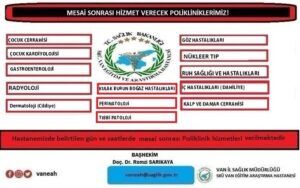 SBÜ Van Eğitim ve Araştırma Hastanesi randevu konusunda sıkıntı yaşayan vatandaşların sıkıntılarını gidermek için bazı polikliniklerde mesai sonrası hizmet veriyor. Hastane yönetimi tarafından bugün mesai sonrası hizmet verecek olan polikliniklerin isimleri paylaşıldı. İşte o isimler; “Çocuk Cerrahisi, Çocuk Kardiyolojisi, Gastroenteroloji, Radyoloji, Dermatoloji (Cildiye), Kulak Burun Boğaz Hastalıkları, Perinatoloji, Tıbbi Patoloji, Göz Hastalıkları, Nükleer Tıp, Ruh Sağlığı ve Hastalıkları, İç Hastalıkları (Dahiliye), Kalp ve Damar Cerrahisi"