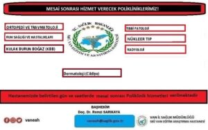 SBÜ Van Eğitim ve Araştırma Hastanesi mesai sonrası insanların mağduriyet yaşamaması adına bazı poliklinklerde mesai sonrası hizmet veriyor. Hastane yönetimi tarafından bugün mesaiden sonra hizmet verecek poliklinikler açıklandı. Bugün mesai sonrası hizmet verecek olan poliklinikler şöyle, “Ortapedi ve Travmatoloji, Ruh Sağlığı ve Hastalıkları, Kulak Burun Boğaz (KBB), Tıbbi Patoloji, Nükleer Tıp, Radyoloji”