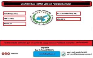 SBÜ Van Eğitim ve Araştırma Hastanesi bugün mesai sonrası hizmet verecek olan poliklinikleri sosyal medya hesaplarından paylaştı. Bugün mesai sonrası hizmet verecek olan poliklinikler şöyle; “Dermatoloji (Cildiye), Tıbbi Patoloji, Radyoloji, Kulak ,Burun, Boğaz (KBB), Nükleer Tıp”