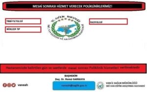 SBÜ Van Eğitim ve Araştırma Hastanesi vatandaşların randevu konusunda mağdur olmamaları için çalışmalarını sürdürüyor. Hastane yönetimi hastaların mağduriyet yaşamaması için bazı polikliniklerinde mesai sonrası hizmet sunuyor. Hastanede bugün mesai sonrası hizmet verecek olan poliklinikler sırasıyla şöyle; “Tıbbi Patoloji, Nükleer Tıp, Radyoloji”