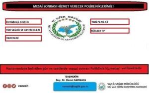 SBÜ Van Eğitim ve Araştırma Hastanesi randevu konusunda sıkıntı yaşayan vatandaşların mağdur olmamaları için bazı polikliniklerde mesai sonrası hizmet veriyor. Hastane yönetimi bugün mesai sonrası hizmet verecek olan poliklinikleri paylaştı. Bugün mesai sonrası hizmet verecek olan poliklinikler sırasıyla şöyle; “Dermatoloji (Cildiye), Ruh Sağlığı ve Hastalıkları, Radyoloji, Tıbbi Patoloji, Nükleer Tıp”