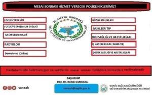 SBÜ Van Eğitim ve Araştırma Hastanesi randevu konusunda sıkıntı yaşayan bazı vatandaşlar için mesai sonrası hizmet veriyor. Hastane yönetimi bugün mesai sonrası hizmet verecekleri poliklinikleri paylaştı. O poliklinikler sırasıyla şöyle; “Çocuk Cerrahisi, Çocuk ve Ergen Ruh Sağlığı, Gastroenteroloji, Radyoloji, Dermatoloji (Cildiye), Göz Hastalıkları, Nükleer Tıp, Ruh Sağlığı ve Hastalıkları, İç Hastalıkları (Dahiliye), Çocuk Sağlığı ve Hastalıkları”