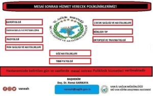 Sağlık Bilimleri Üniversitesi Van Eğitim ve Araştırma Hastanesi vatandaşların randevu konusunda sıkıntı yaşamamaları için bazı polikliniklerde mesai sonrası hizmet veriyor. Hastane yönetimi tarafından bugün mesai sonrası hizmet verecek olan poliklinikler paylaşıldı. O polikliniklerin isimleri sırasıyla şöyle; “Kardiyoloji, Endokrinoloji ve Metabolizma, Radyoloji, Ruh Sağlığı ve Hasatlıkları, Çocuk Sağlığı ve Hastalıkları, Nükleer Tıp, Ortopedi ve Travmatoloji, Göz Hastalıkları, Tıbbi Patoloji”