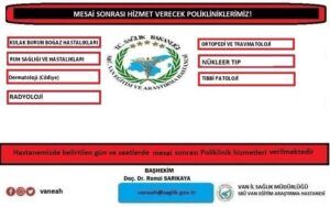 SBÜ Van Eğitim ve Araştırma Hastanesi bugün mesai sonrası hizmet verecek olan polikliniklerin isimlerini paylaştı. O polikliniklerin isimleri sırasıyla şöyle; “Kulak, Burun, Boğaz Hastalıkları, Ruh Sağlığı ve Hastalıkları, Dermatoloji, Cildiye, Radyoloji, Ortopedi ve Travmatoloji, Nükleer Tıp, Tıbbi Patoloji”
