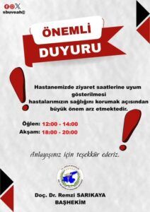 "Hastanede ziyaret saatlerine uyum gösterilmesi, hastalarımızın sağlığını korumak açısından büyük önem arz etmektedir. Ziyaret saatleri; Öğlen: 12:14, Akşam: 18:20 saatleri arasındadır. Anlayışınız için teşekkür ederiz."