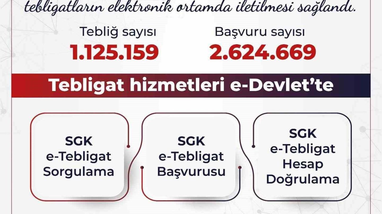 Çalışma ve Sosyal Güvenlik Bakanı Vedat Işıkhan, Sosyal Güvenlik Kurumu (SGK) Elektronik Tebligat Uygulaması ile 1 milyon 125 bin 159 tebligatın yapıldığını bildirdi.