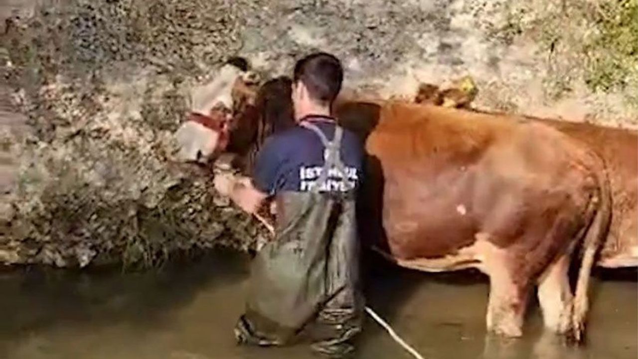 Şile'de Yeşilçay Deresi'ne 4 büyükbaş hayvan düştü. Çevredekilerin ihbarı üzerine itfaiye ekiplerine haber verildi. İhbar üzerine olay yerine gelen ekipler dereye düşen 4 büyükbaş hayvanı kurtarmak için çalışma başlattı. Bota binen ekipler, 4 hayvanı halat ile birbirine bağlayarak kıyıya kadar çekti. 4 büyükbaş hayvanı kurtarma anları ekipler tarafından kaydedildi.