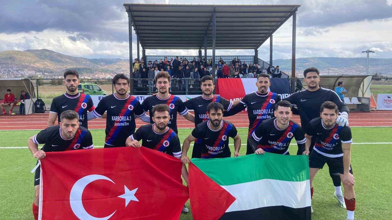 Balıkesir Bigadiç Dört Eylül Stadı’nda Sındırgı Belediyespor - Bigadiç Etibor Spor arasında gerçekleştirilen müsabaka öncesi sporcular sahaya Türk Bayrağı ve Filistin Bayrağı ile çıktı. İki takımın oyuncuları verdikleri destek mesajı sonrası kıran kırana mücadele etti.