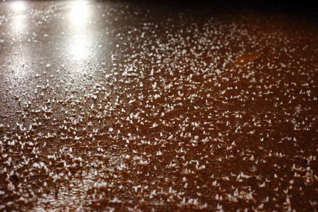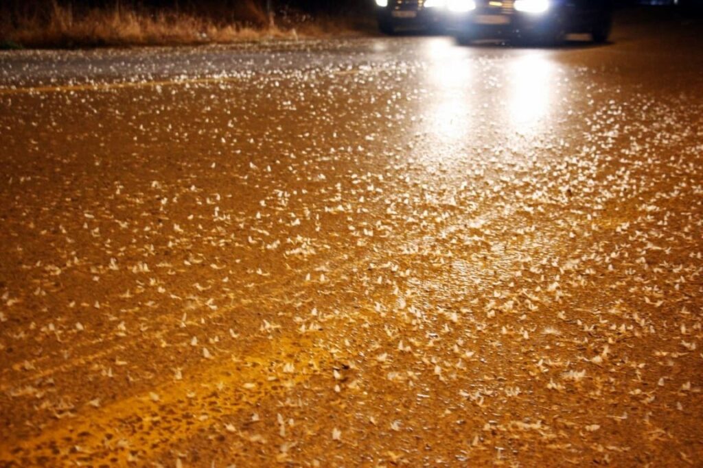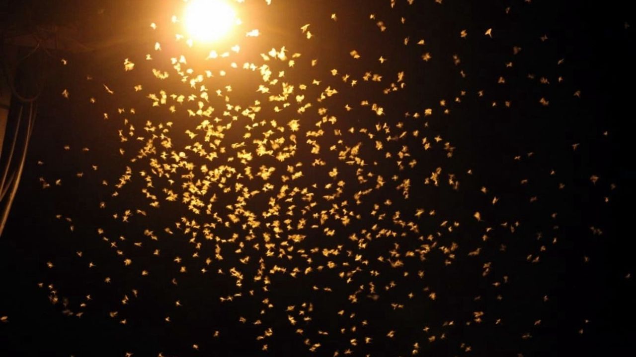 Her yıl gerçekleşen bu doğa olayı, binlerce sineğin sokak ışıkları etrafında topluca uçup son anlarını yaşamasıyla dikkat çekiyor.